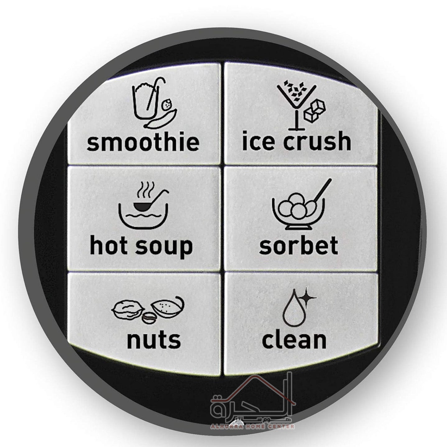- 6 برامج تلقائية مع بداية ناعمة: سموثي، ايس كراش، شوربة ساخنة (عن طريق الاحتكاك من الشفرات السريعة)، سوربيت، مكسرات، تنظيف تلقائي