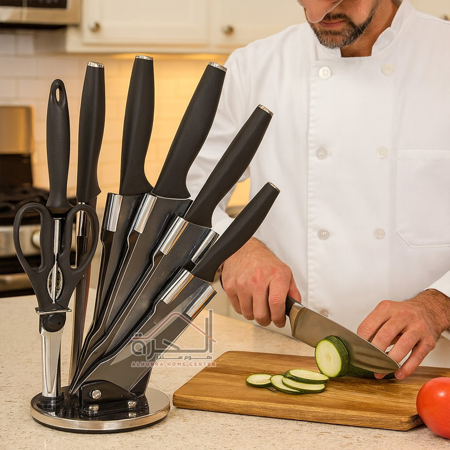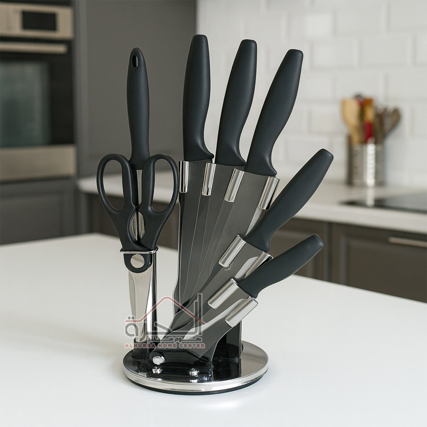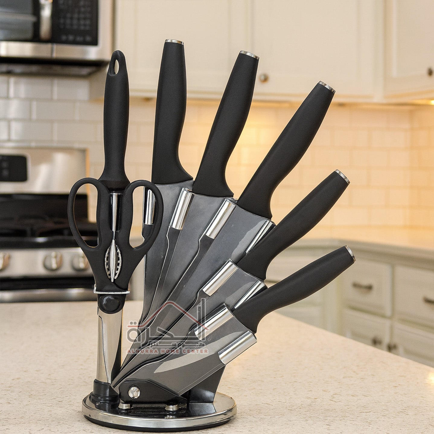 5 سكاكين و مقص مطبخ و مسن سكاكين و ستاند