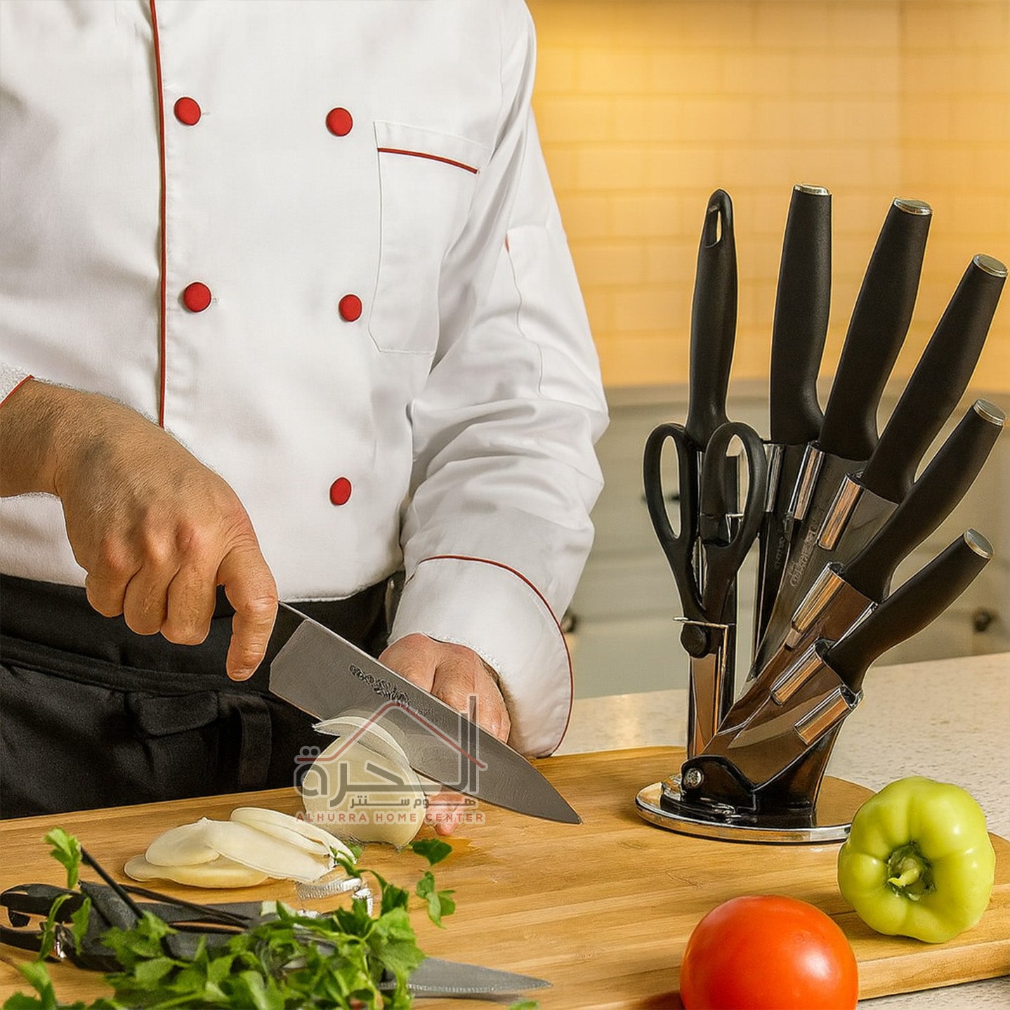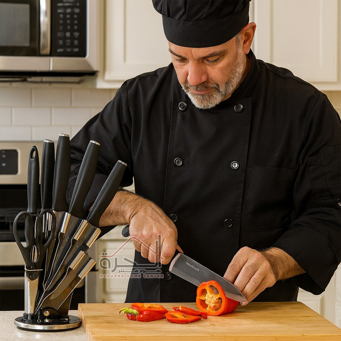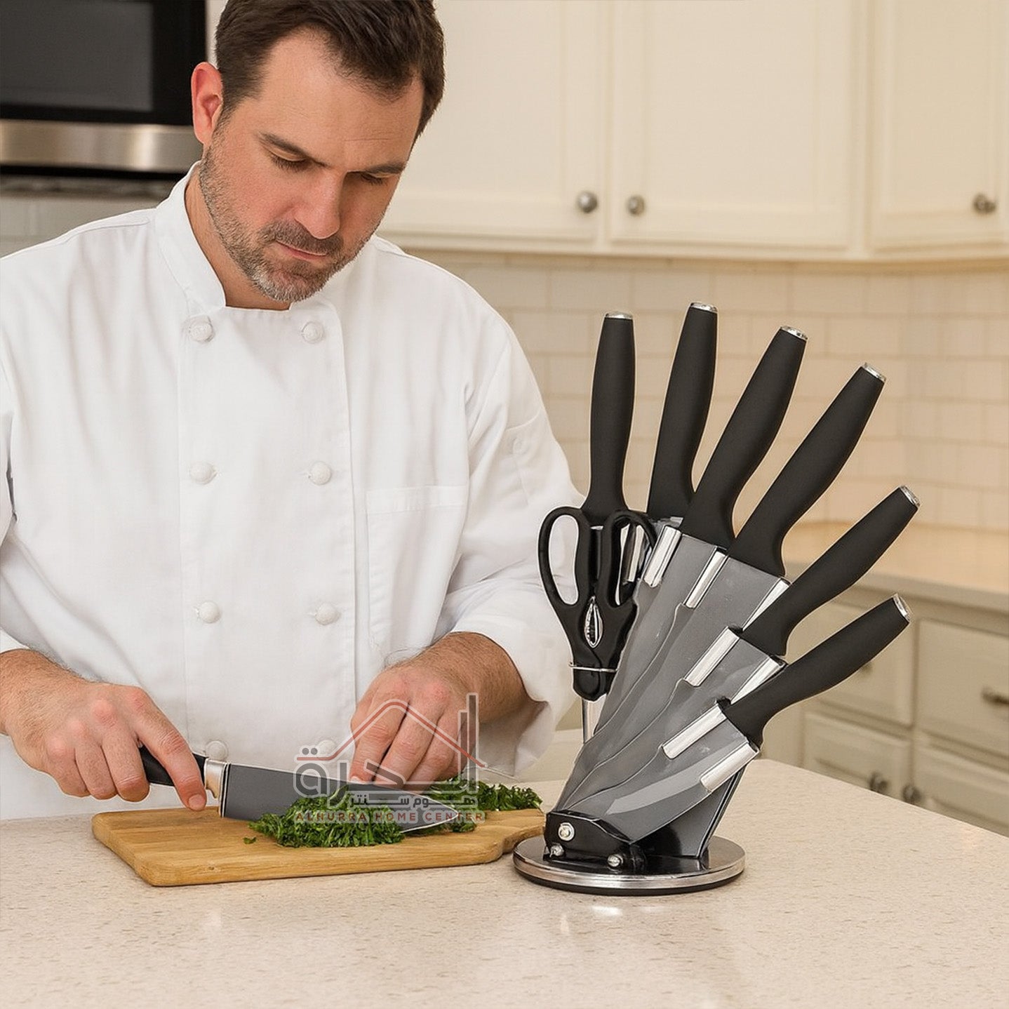 5 سكاكين و مقص مطبخ و مسن سكاكين و ستاند