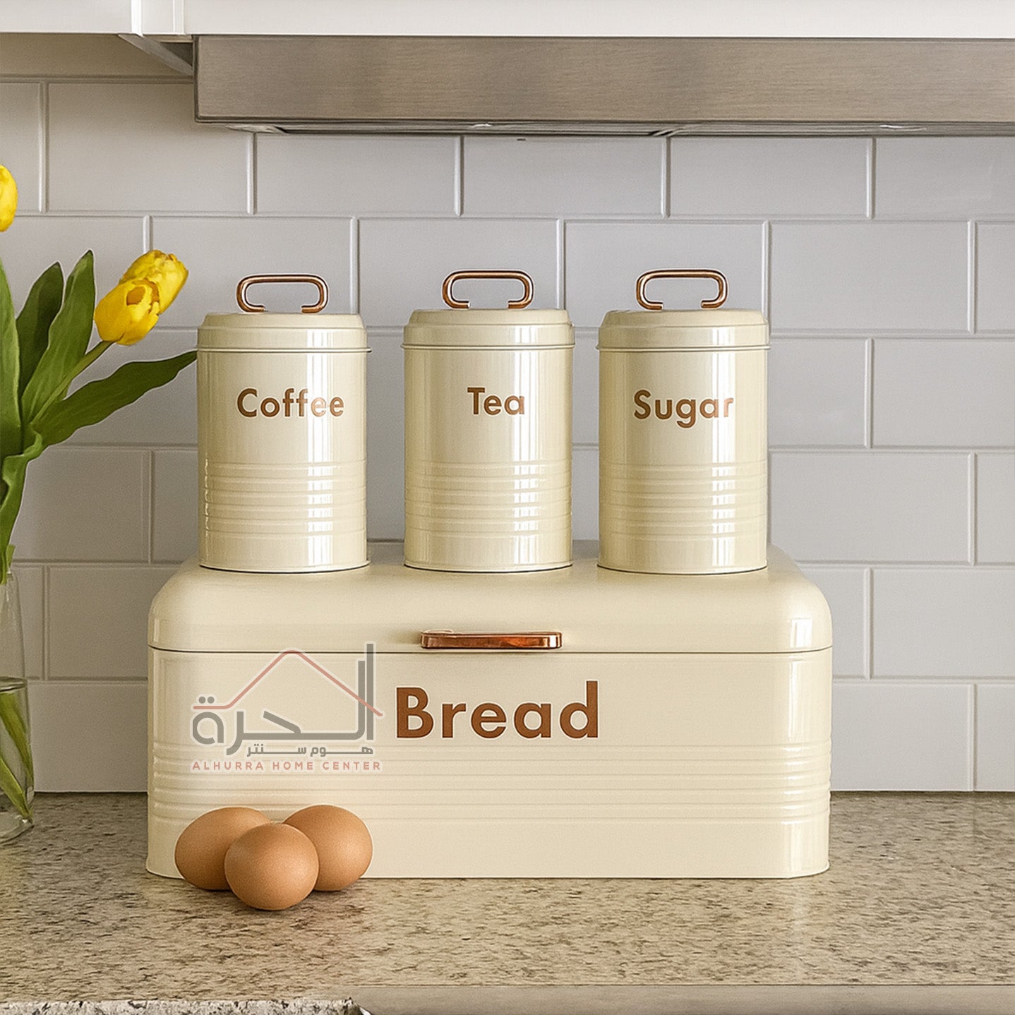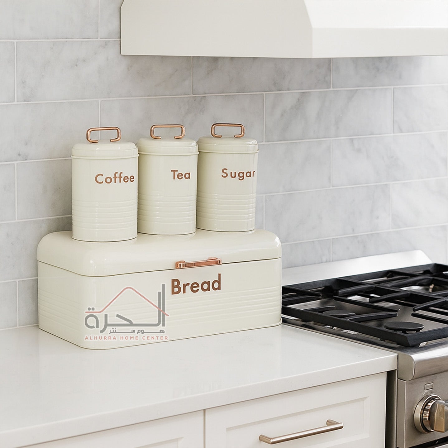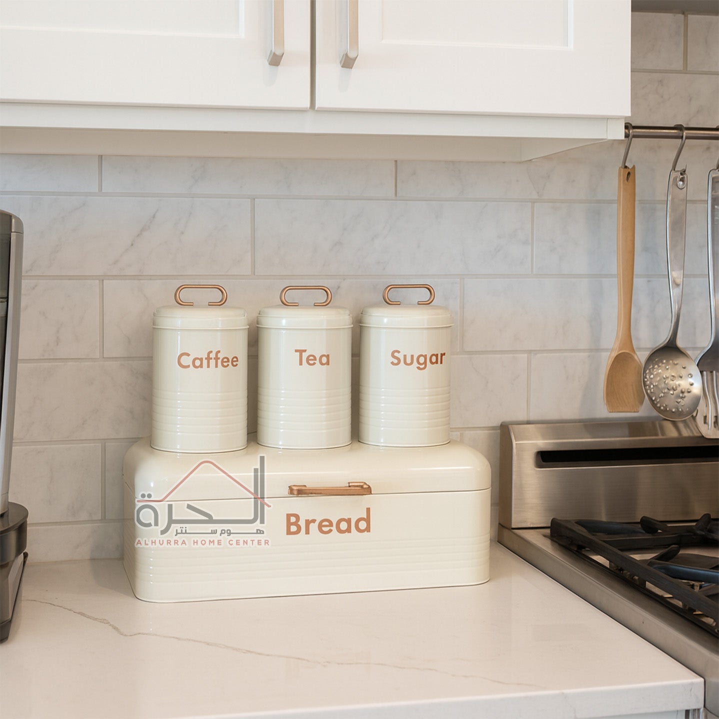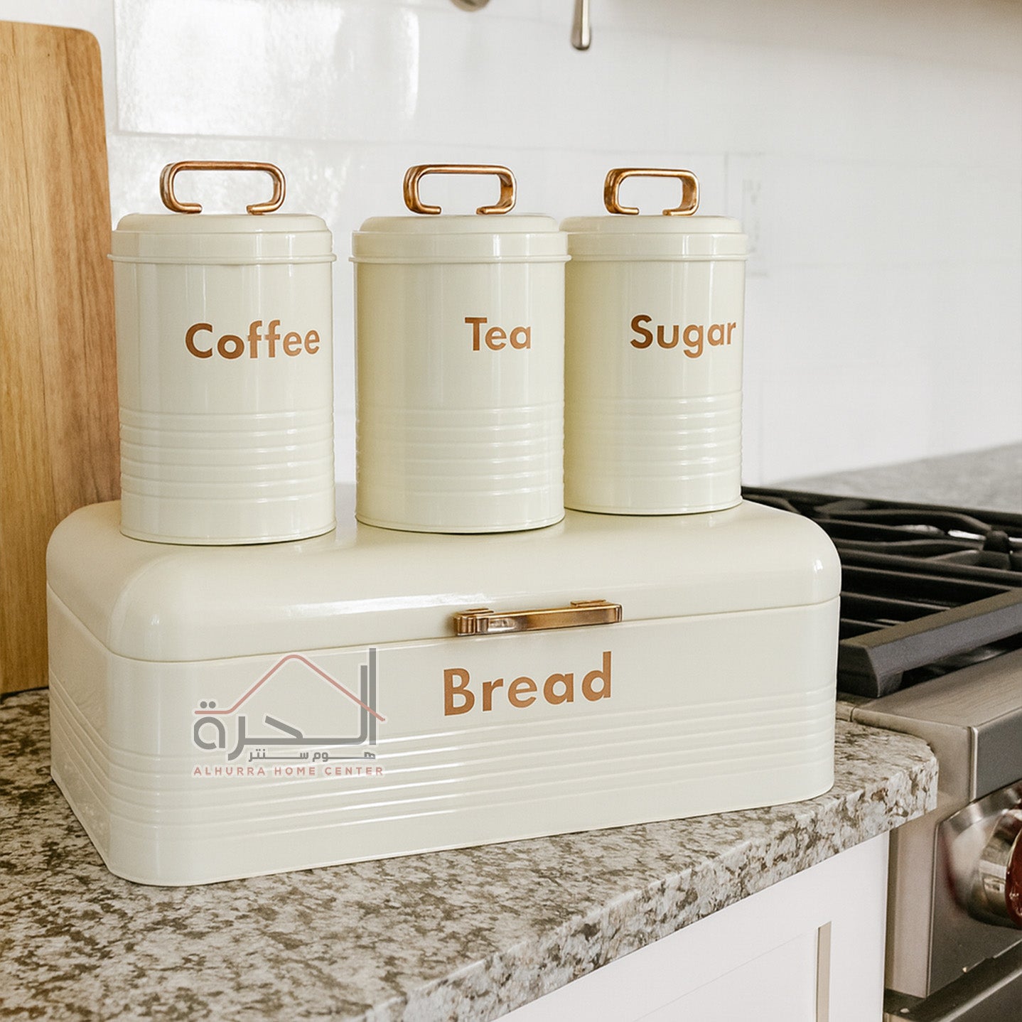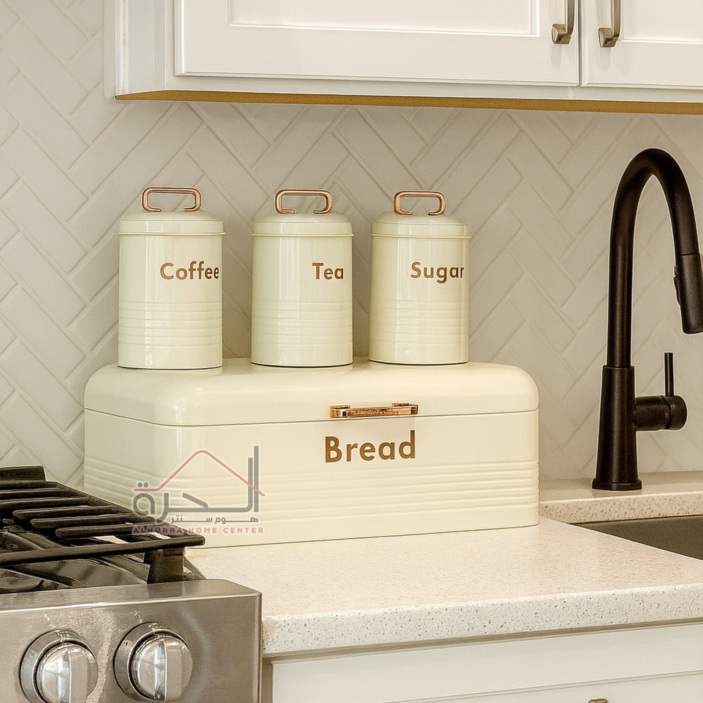 علبة خبز مع 3 متربنات حديد بيج