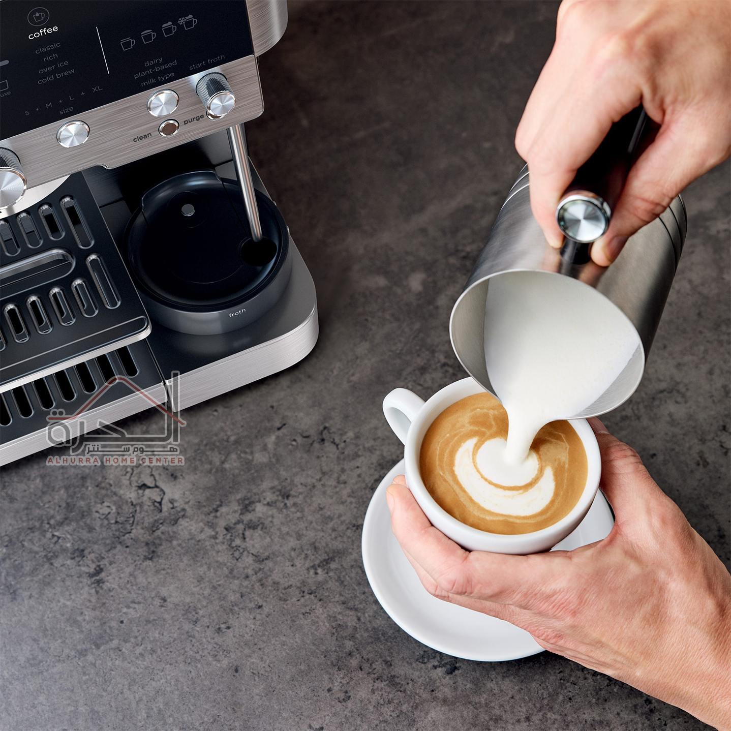 رغوة الحليب: تحتوي على جهاز مخصص لرغوة الحليب، مع خيارين لعمل رغوة دقيقة أو سميكة، ورغوة حليب باردة أو ساخنة.